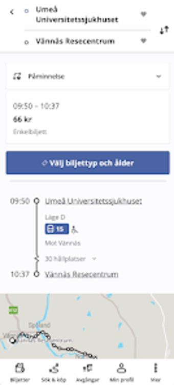 여행 플래너는 목적지 간의 최적의 여행 옵션을 찾아주며, 심지어 베스테르부텐 외부인 예멘트란드(Jämtland), 베스테르노르란드(Västernorrland) 및 놈볼렌(Norrbotten)의 인근 군과 도시에 대한 티켓 구매도 제공합니다. 현재 위치를 활용하여 앱이 여행 옵션을 검색하고 현재 위치를 기반으로 다가오는 출발을 표시할 수 있습니다.